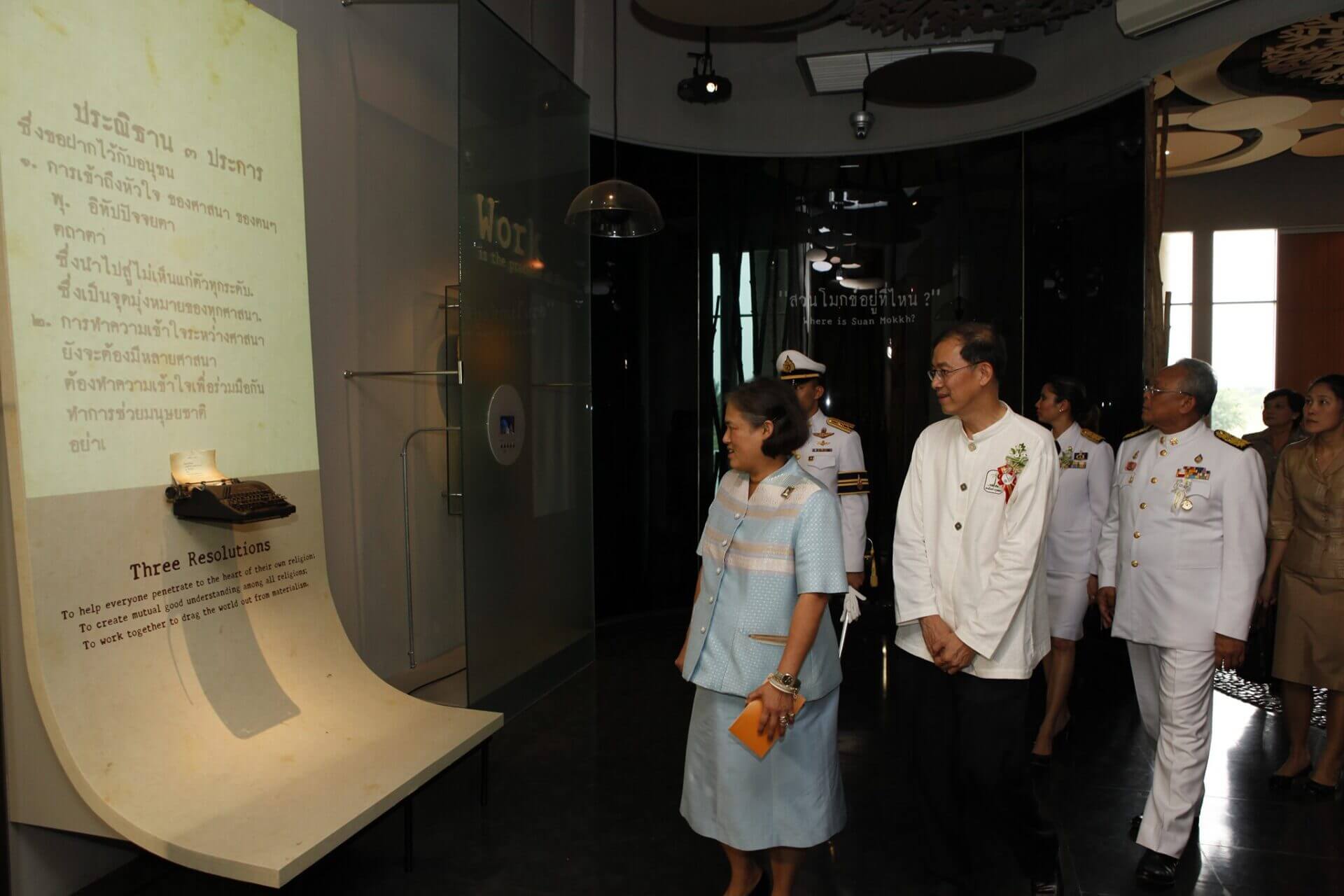 ต่อมา เสด็จฯ ไปยังแท่นกดปุ่มไฟฟ้าเพื่อเปิดแพรคลุมป้าย “หอจดหมายเหตุพุทธทาส อินทปัญโญ” ก่อนจะเสด็จทอดพระเนตรนิทรรศการและพื้นที่ต่าง ๆ ได้แก่
