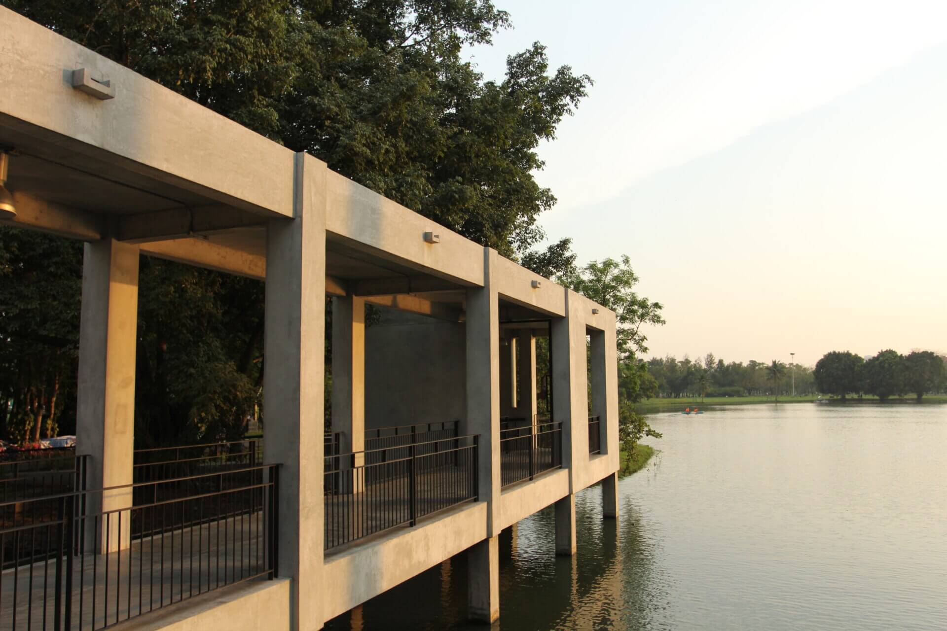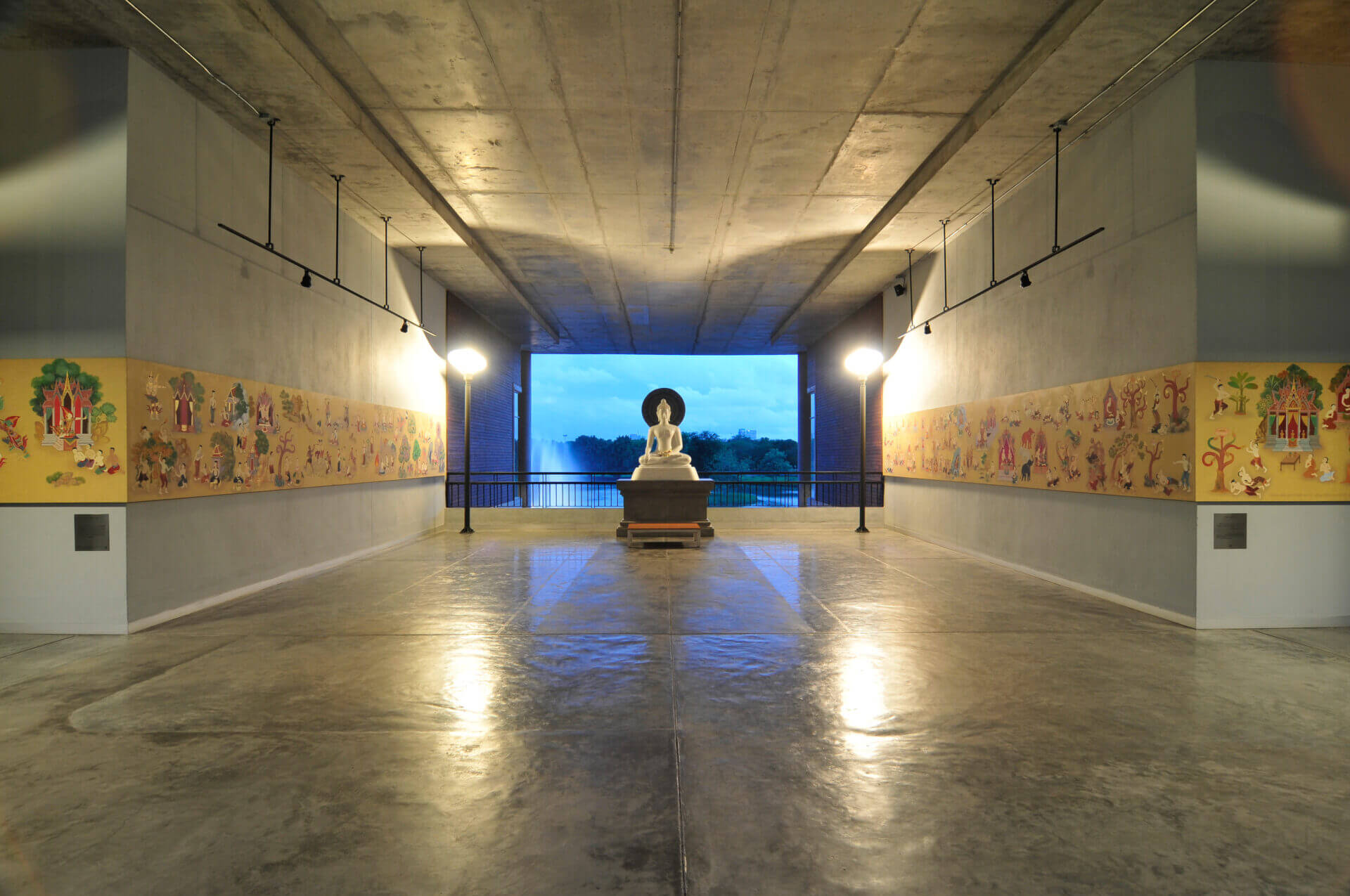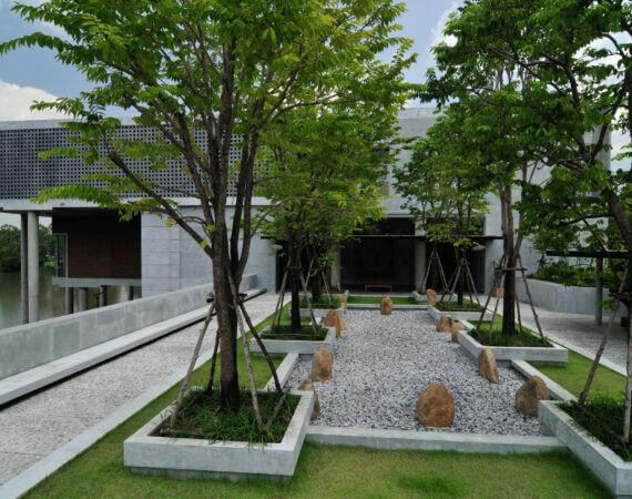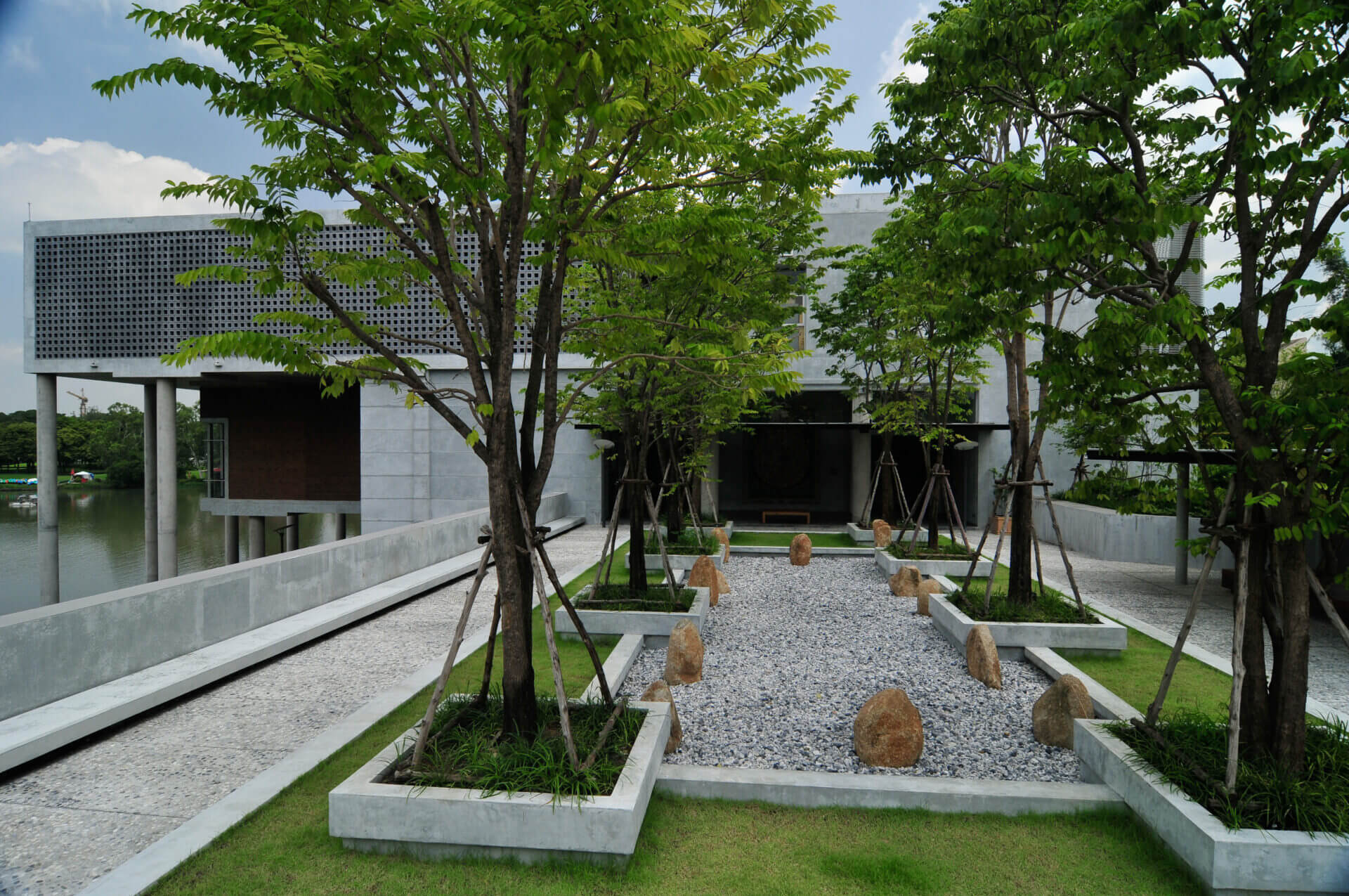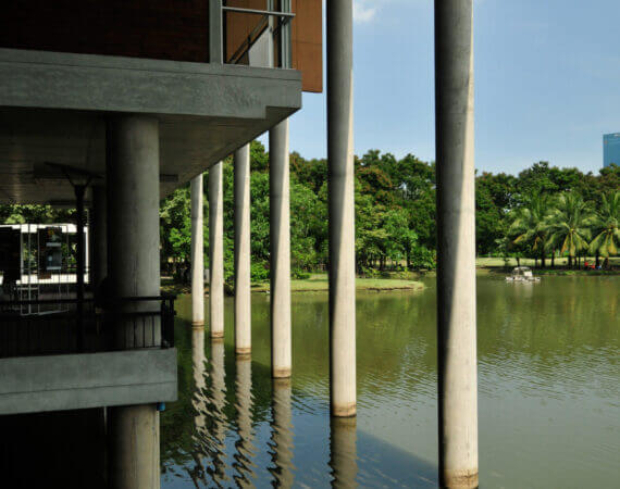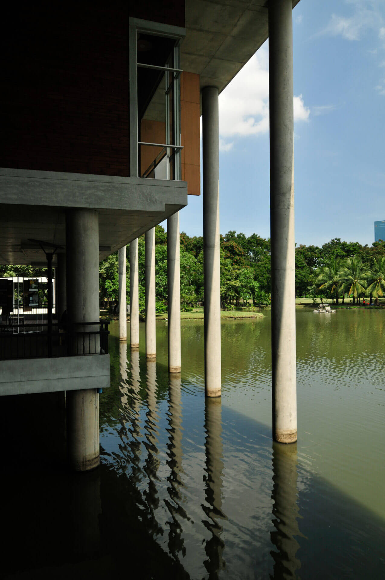 หอจดหมายเหตุ พุทธทาส อินทปัญโญ หรือ ‘สวนโมกข์’ ในสวนวชิรเบญจทัศอันร่มรื่น คือสถาปัตยกรรมโมเดิร์นเหนือผิวน้ำที่สะท้อนแนวคิดและชีวิตสมถะของท่านพุทธทาสภิกขุ ความ ‘น้อยแต่มาก’ ดูจะเป็นคติธรรมที่แฝงอยู่ในทุกมุมตึกและทางเดินของสถานปฏิบัติธรรมแห่งยุคสมัยแห่งนี้