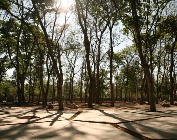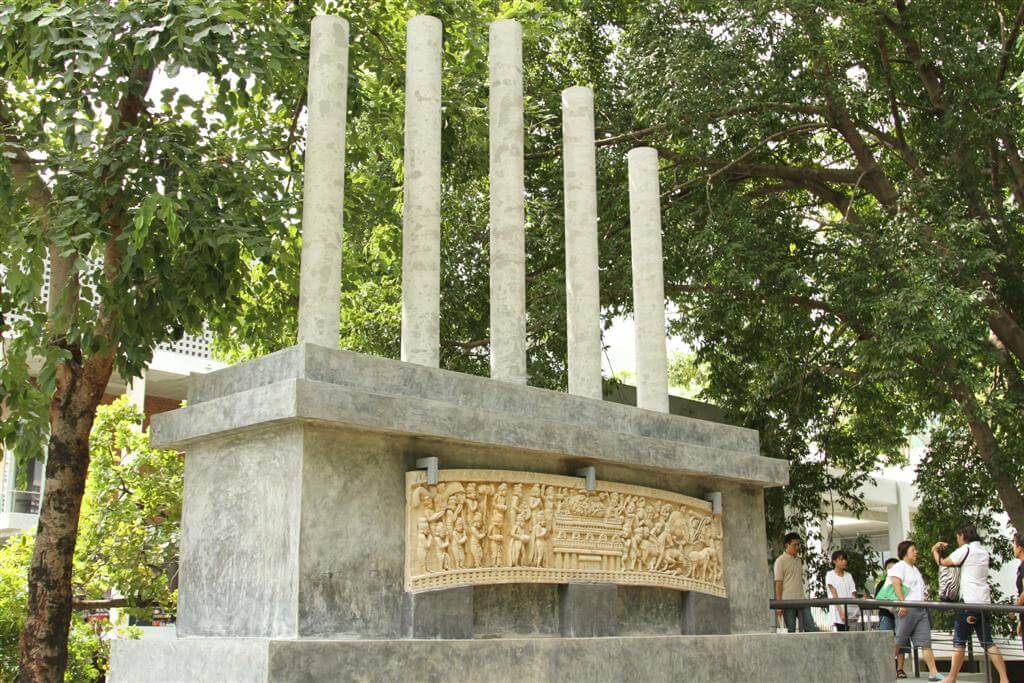 อีกหนึ่งผลงานศิลปะที่ยกมาจากสวนโมกข์ในอำเภอไชยา คือเสา 5 ที่ท่านพุทธทาสภิกขุออกแบบด้วยตนเอง เสาทั้ง 5 ต้นเป็นตัวแทนของขันธ์ 5 อันหมายถึงกองแห่งรูปธรรมและนามธรรมทั้ง 5 ที่ทำให้เกิดเป็นตัวตนหรือชีวิต เนื่องจากขันธ์ 5 นั้นเป็นตัวนำไปสู่ความทุกข์ ท่านจึงออกแบบให้เสาไม่มีส่วนหัว เป็นเพียงฐานเชิงสัญลักษณ์ที่พยุงไว้ซึ่งความว่างเปล่า