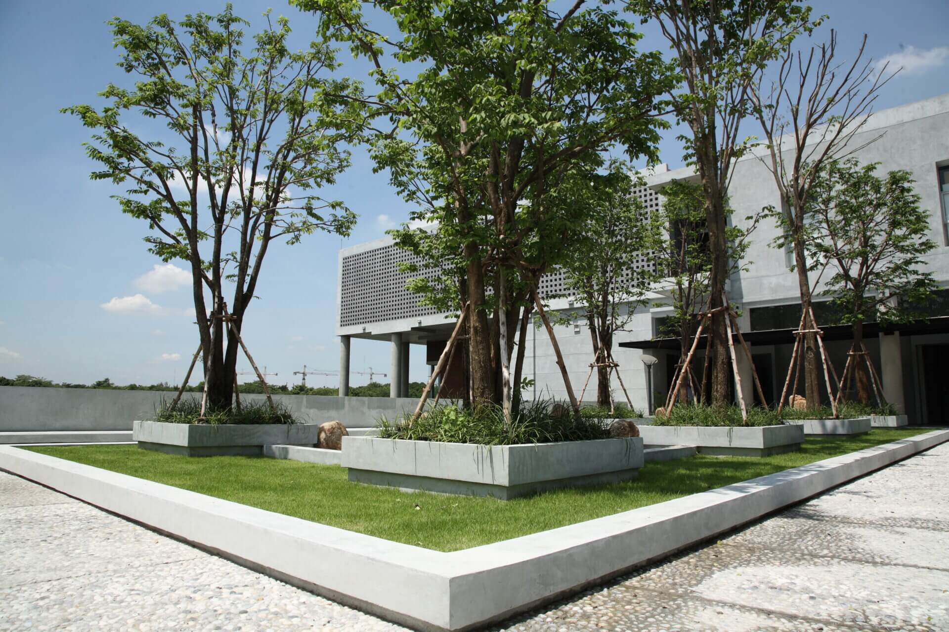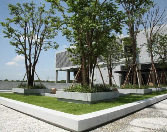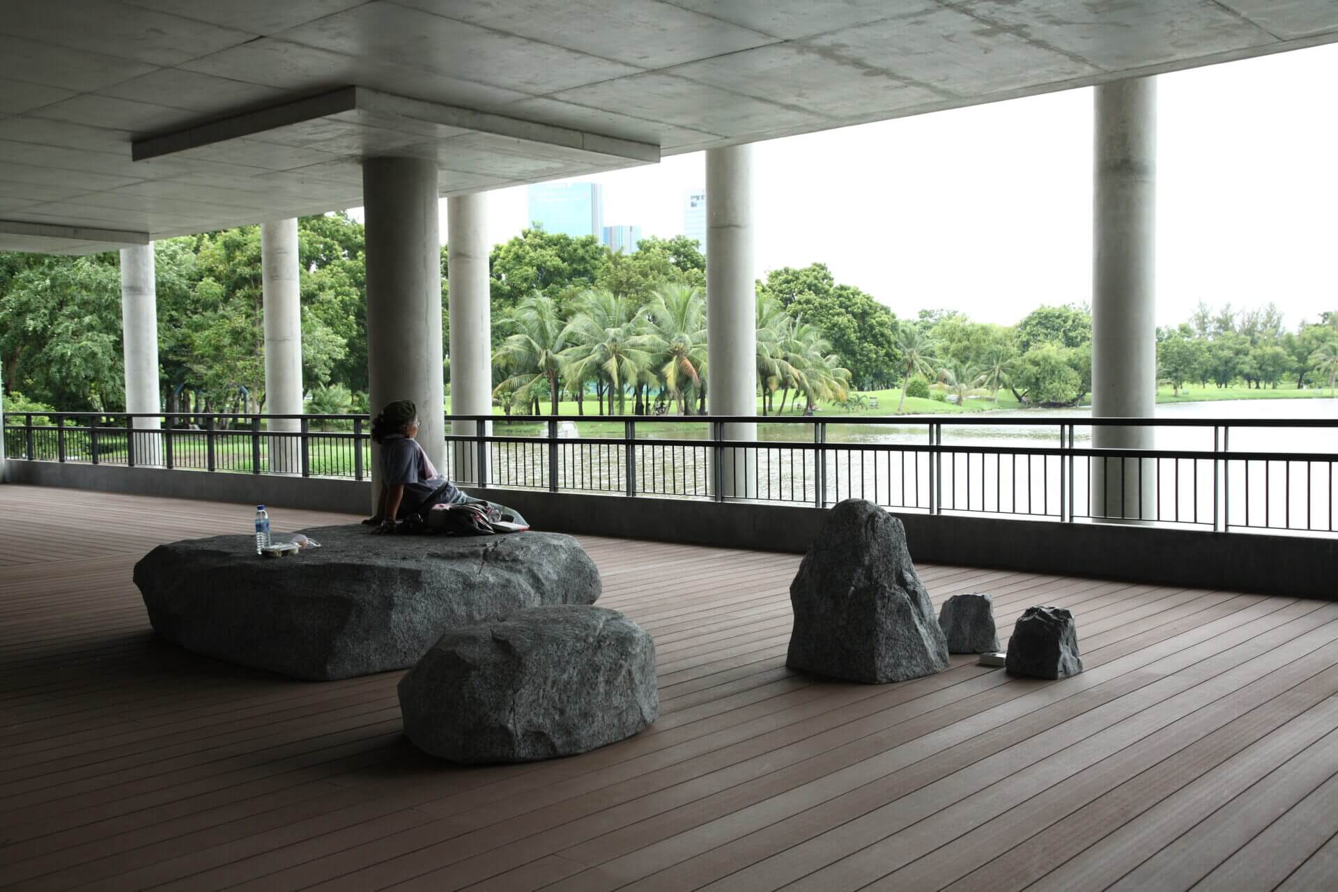 “ช่วงนั้นมีคนวิจารณ์เยอะมาก พวกเขาพูดทำนองว่า โครงการนี้สร้างในนามท่านพุทธทาส อย่าบังอาจตัดต้นไม้ในสวนสักต้นเชียว เราเลยตัดสินใจสร้างอาคารกลางสระน้ำทางทิศเหนือของสวนรถไฟแทน สุดท้ายเราก็ไม่ได้ตัดต้นไม้สักต้นจริงๆ ไม้ที่ใช้ในการก่อสร้างทั้งหมดเป็นไม้เทียมรีไซเคิล ซึ่งราคาก็ถูกกว่าด้วย” นพ.บัญชากล่าวเสริม นอกจากนี้ ยังมีการใช้ไม้อัดซีเมนต์ในส่วนที่เป็นพื้นที่กึ่งกลางแจ้ง เพื่อลดต้นทุนค่าบำรุงรักษา ขณะที่ตัวอาคารนั้นได้รับการออกแบบให้เป็นมิตรต่อสิ่งแวดล้อม โดยวัสดุหลักที่ใช้นั้นสามัญเรียบง่าย “ไม่ได้หวือหวาหรือราคาแพง” ธีรพลกล่าว