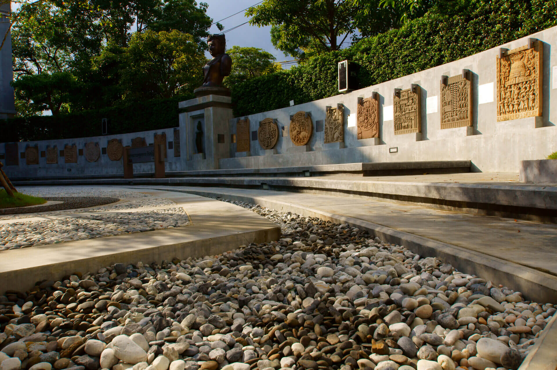 นอกจากนั้นแล้ว พื้นที่ต่างๆ ภายในอาคารยังถูกออกแบบให้เป็นเส้นทางธรรมะในตัว บริเวณลานจอดรถมีชื่อเรียกว่า ‘ลานแห่งความไม่รู้ (Ignorance Court)’ เพราะหลายคนที่มาถึงนั้นยังไม่มีความรู้แจ้งทางธรรม เมื่อเดินพ้นประตูทางเข้าหลักมา จะพบกับเสาขันธ์ 5 และทางเดินเลียบสระน้ำซึ่งเชื่อมไปสู่สวนหย่อมต่างๆ เพื่อสงบอารมณ์วุ่นวายของชีวิตประจำวัน ตามคำกล่าวของธีรพล ขณะที่ลานหินโค้งและสวนพุทธธรรมนั้นเป็นจุดศูนย์กลางของพื้นที่ และมีขั้นบันไดพาลงไปสู่สวนสีเขียวด้านหลัง