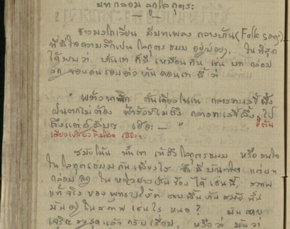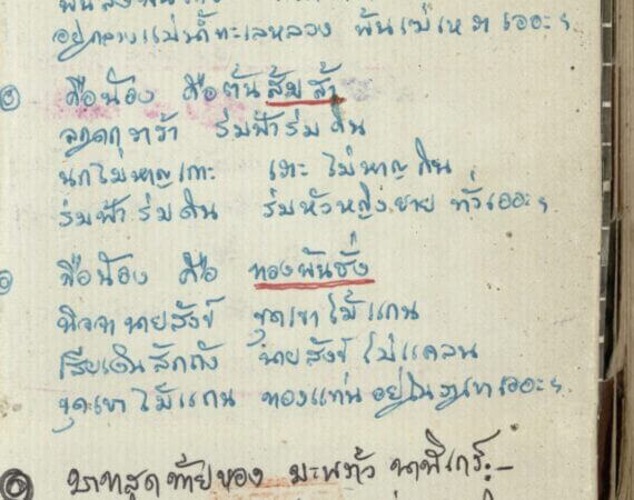 “พร้าวนาฬิเก ต้นเดียวโนเน กลางทะเลขี้ผึ้ง ฝนตกไม่ต้อง ฟ้าร้องไม่ถึง กลางทะเลขี้ผึ้ง ไปถึงแต่ผู้มีบุญ เฮอะ__” /ต้นเดียวเปลี่ยวลิงโลด เฮอะ.สมัยโน้น นั้นเขา เข้าถึงโลกุตรธรรม หรือสนใจในโลกุตรธรรมกันเพียงไร จึงมีบัณฑิต แต่งบทกล่อมลูก ให้หญิงชาวบ้าน ร้องได้เช่นนี้, สภาพแท้จริง ของพุทธบริษัท ตามพื้นบ้านสมัยนั้น มันอยู่ในสภาพเช่นไรหนอมันเคยเจริญสูงสุดแล้วกลับเสื่อม, หรือว่า มันว่าเพ้อๆ กันไปอย่างนั้นเอง ; แต่มันจะเปนไปได้อย่างไรมะม่วงหิมพานต์ สุกงอมหอมหวาน อยู่กลางแม่น้ำทะเลหลวงพ้นลิงพ้นค่าง พ้นสัตว์ทั้งปวง อยู่กลางแม่น้ำทะเลหลวง พ้นเฆ่ เหรา เอย.”บันทึกนึกได้เอง 2495 (1952)